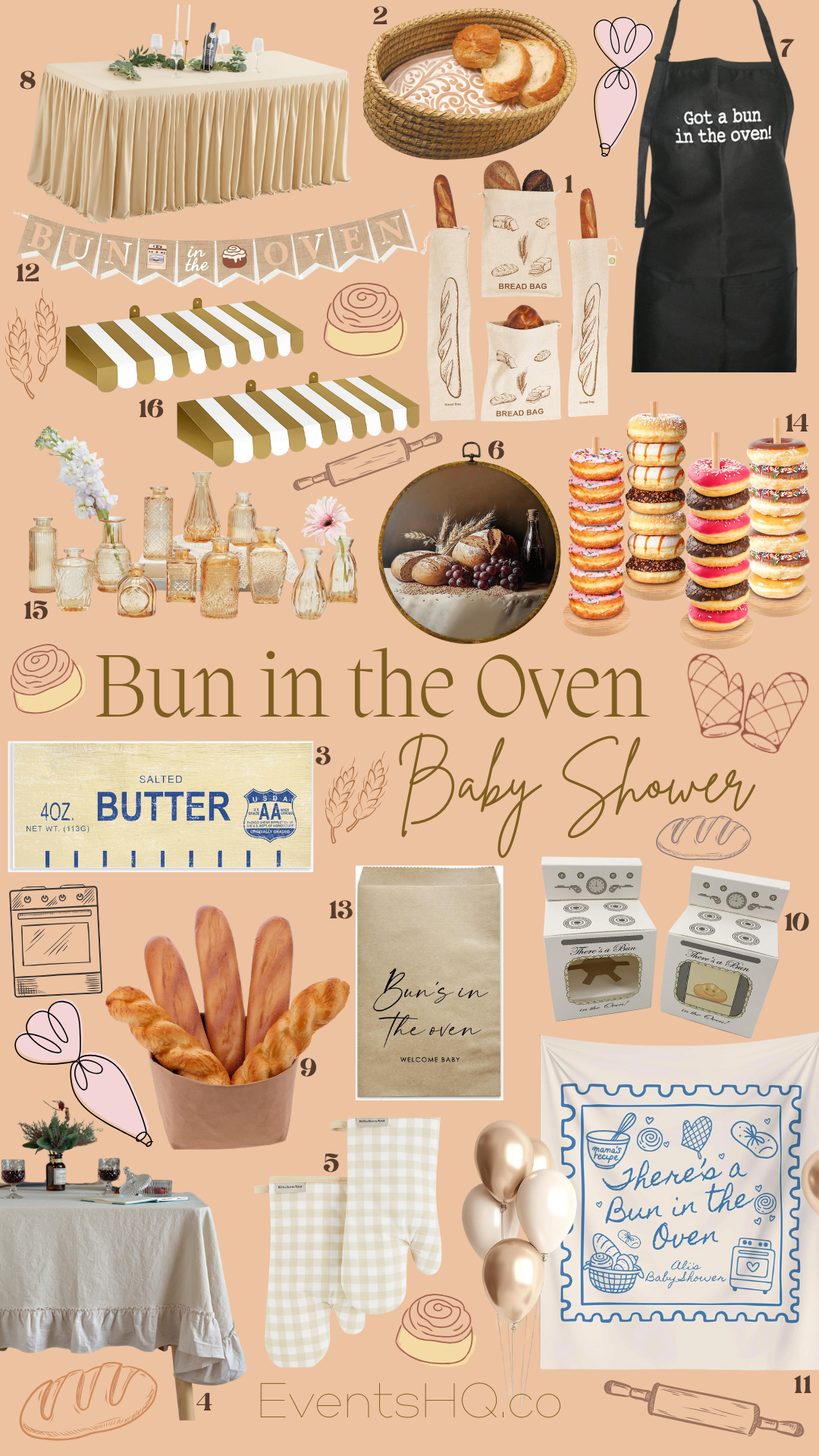 The Bun in the Oven Baby Shower is cozy, playful, and neutral — perfect for winter or any season when you want an indoor celebration. The vibe is inspired by a warm bakery, with shades of tan, cream, soft butter yellow, and wood accents. Think breads, buns, pastries, and ovens — a theme that feels both whimsical and welcoming. Guests will love the unique details, and you’ll love how many of the items can double as décor and functional pieces after the event.