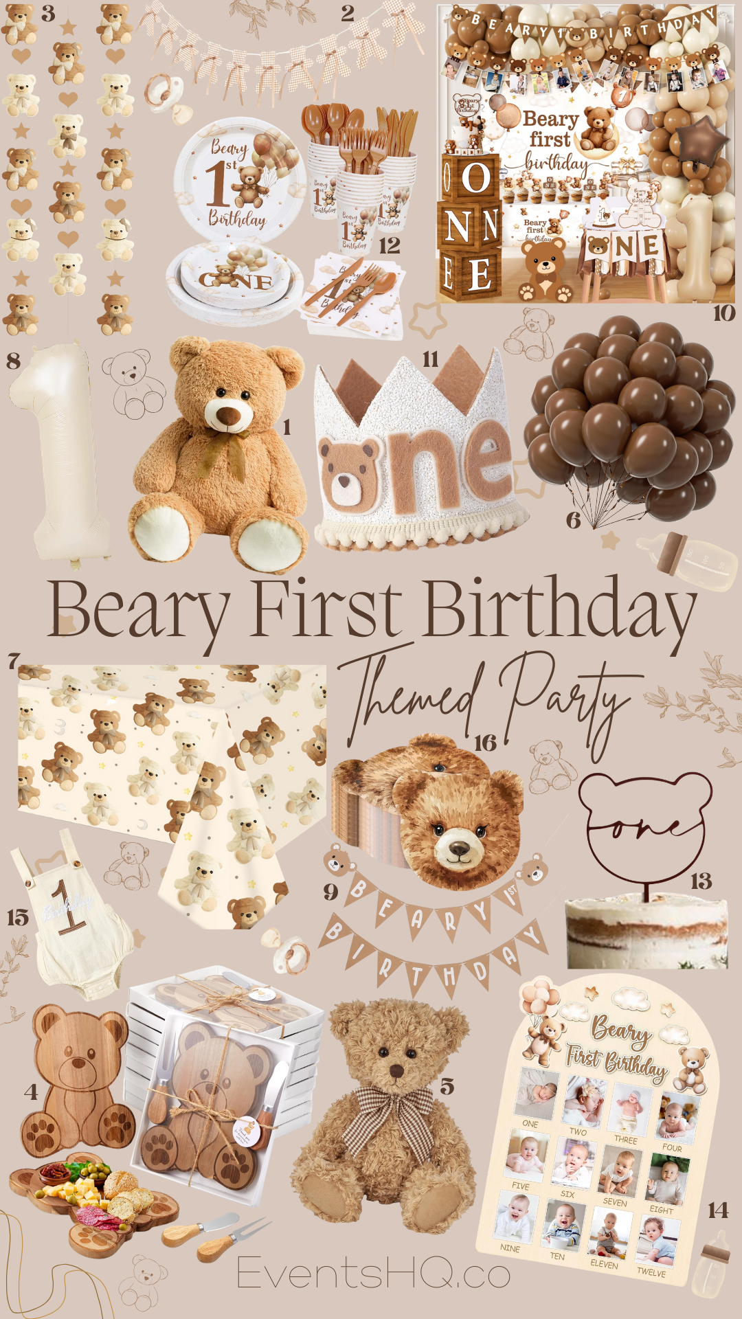 Soft, cozy, and oh-so-sweet, the Beary First Birthday is a teddy bear–themed celebration made for your little cub. With neutral tones, cuddly décor, and endless bear-y cute details, this gender-neutral theme works for any baby turning one. It’s the perfect way to celebrate a whole year of snuggles, giggles, and firsts.