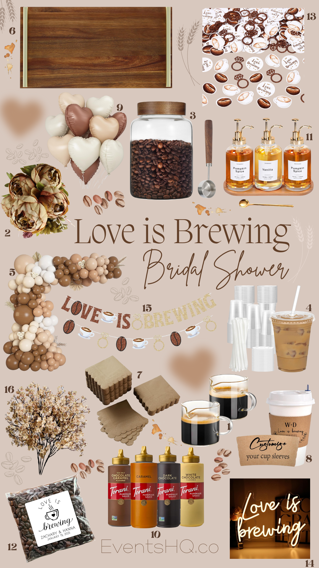 Celebrate love with a cozy coffeehouse twist! This theme blends rich tones of mocha, caramel, and cream with romantic touches of florals and glowing décor. From espresso cups and syrup dispensers to coffee-toned balloons and personalized favors, every detail is designed to make guests feel like they’ve stepped into a chic café made just for you. Perfect for coffee lovers, this bridal shower setup is warm, stylish, and oh-so inviting—because nothing brings people together quite like love (and lattes).