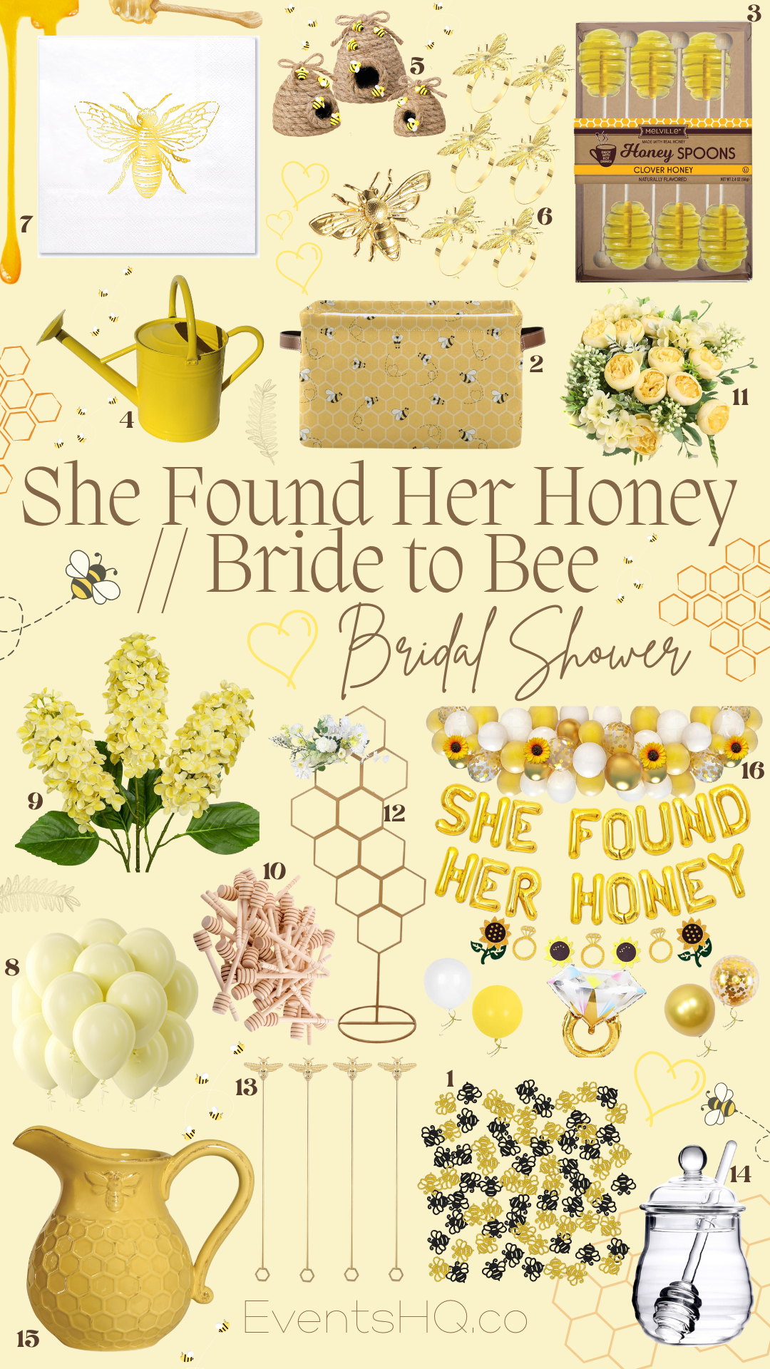 Sweet as honey and buzzing with love—welcome to your “She Found Her Honey // Bride to Bee” bridal shower! Picture a warm honeycomb palette of butter yellow, cream, and gold, layered with delicate blooms, golden bee accents, and a sunny balloon arch that sets the scene for swoon-worthy photos. Create a cozy hive with a tea-and-honey bar, signature “Honey Bride” sips, and drizzly treats, then sprinkle bee confetti and mini beehives across your tables for instant charm. Thoughtful touches—like honey dippers as favors, gilded napkin rings, and a chic honeycomb backdrop—tie everything together without feeling fussy. It’s whimsical, elegant, and oh-so-sweet… the perfect way to celebrate your queen bee before she says “I do.”